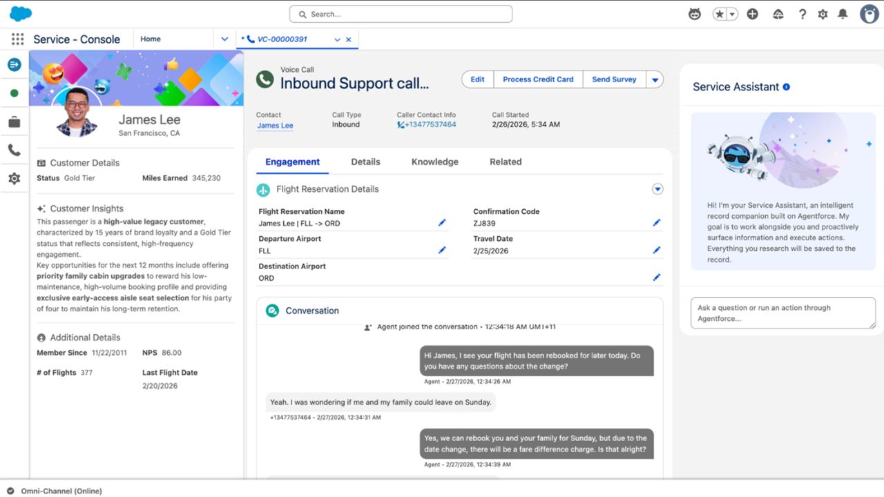 - KI-Agenten für alle Kanäle: Kundeninformationen und ‑historie aus Vertrieb, Marketing und Service werden in einer einheitlichen Ansicht für alle Beteiligten und Kanäle zusammengeführt. KI-Agenten können dadurch selbstständig im Kundenauftrag handeln, beispielsweise Flüge umbuchen.
